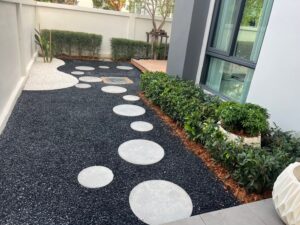 การคุมโทนไม่ใช่เป็นเรื่องของต้นไม้หรือพรรณไม้เท่านั้น แต่หากเราใช้ฮาร์ดสเคปเข้ามากำหนดก็เป็นการคุมโทนอีกแบบหนึ่งเช่นกันค่ะ ซึ่งก็จะเห็นชัดเจนกว่าพรรณไม้อีกด้วย เช่น การใช้วัสดุกับแผ่นทางเดิน กระถาง หรือแม้แต่ศาลาก็เป็นจุดนำสายตาที่ทำให้สวนมีจุดเด่นและความกลมกลืนไปในตัว เช่น อาจจะใช้ทางเดินสีเอิร์ธโทน เพื่อให้ดูเป็นธรรมชาติมากขึ้น หรือพื้นเป็นสีดำให้ดูคลาสิก เป็นต้น
